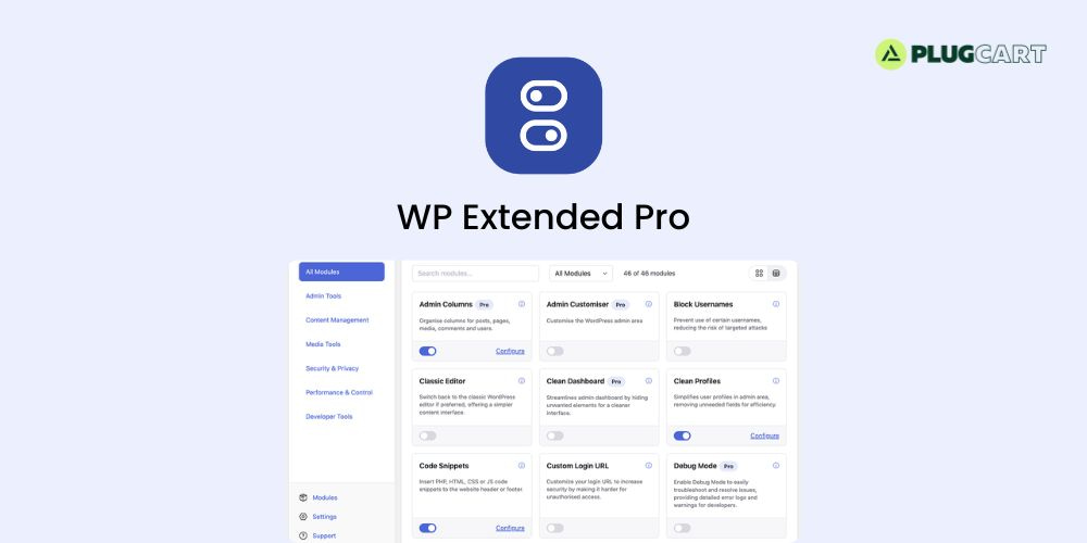 Boasting over 40 modules, WP Extended can replace many of your plugins with a single seamless solution that is continuously getting better.
